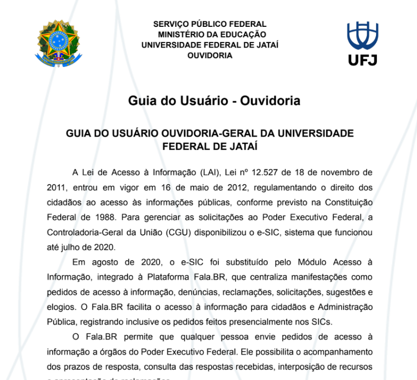 InícioManuais e Guias Guia Lilás Guia do Usuário Ouvidoria Guia do Manifestante Guia do Denunciante Cadastro Fala BR Registro de Manifestações Cartilha Educando para as Relações Etnico-Raciais
